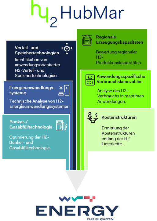 With our funded project H2HubMar, we are making a significant contribution to the CAPTN Energy Alliance. The alliance is developing innovative solutions for the provision of renewable energies for maritime applications. The focus of this field of innovation is on conversion and storage, transport, temporary storage, land-sea interfaces, and on-board conversion of energy sources at the point of consumption.